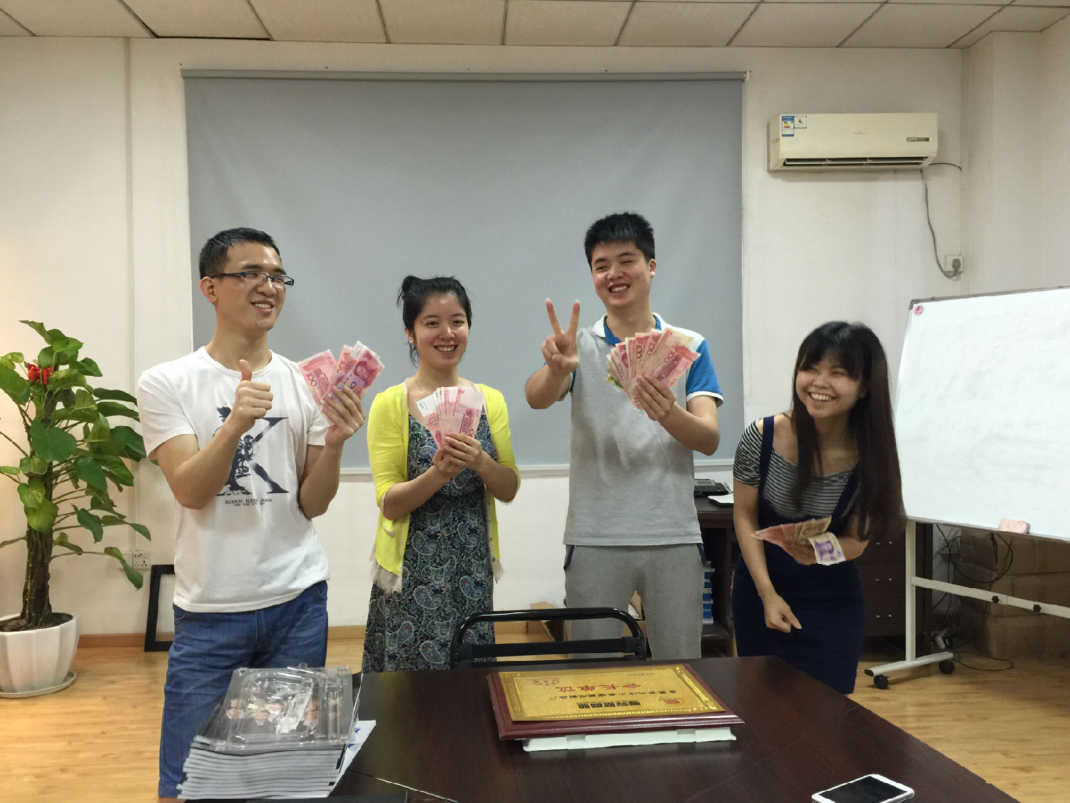 在英硕工作很开心,每天被这种工作气氛所感染,而且每个人都非常能干,看这周我们拿奖金的伙伴,开心的合不拢嘴,要请客哟,第一位帅哥是负责我们公司网络运营的,他有非常强的网络实战经验,我们公司高大上的网站就是出自他的手,中间这位美女是我们外贸部的伍姐姐,英文水平一流,而且还是外贸业务成交高手,看她与外国客户沟通起来真诚自信的表情,真是好生羡慕呀,第3位是负责阿里巴巴平台的推广工作,我们阿里超级旺铺就是他的功劳啦 ,最后一位小美女是我们跟单业务和售后服务,她的甜美声音可是迷到一大片哦。下周拿奖金的又会是那些人呢?做为一个新人,也要给自己定个目标,下个月也要拿奖,不然跟不上大伙的步伐呀。